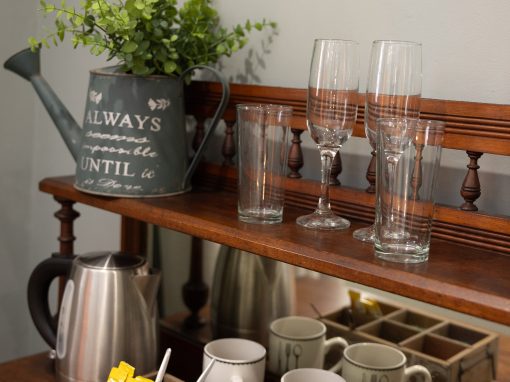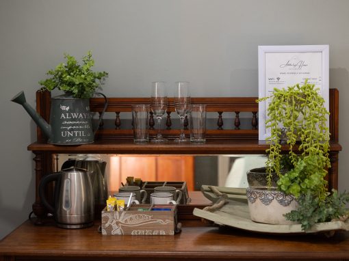 Each room includes a kettle, mugs, and complimentary tea and coffee.